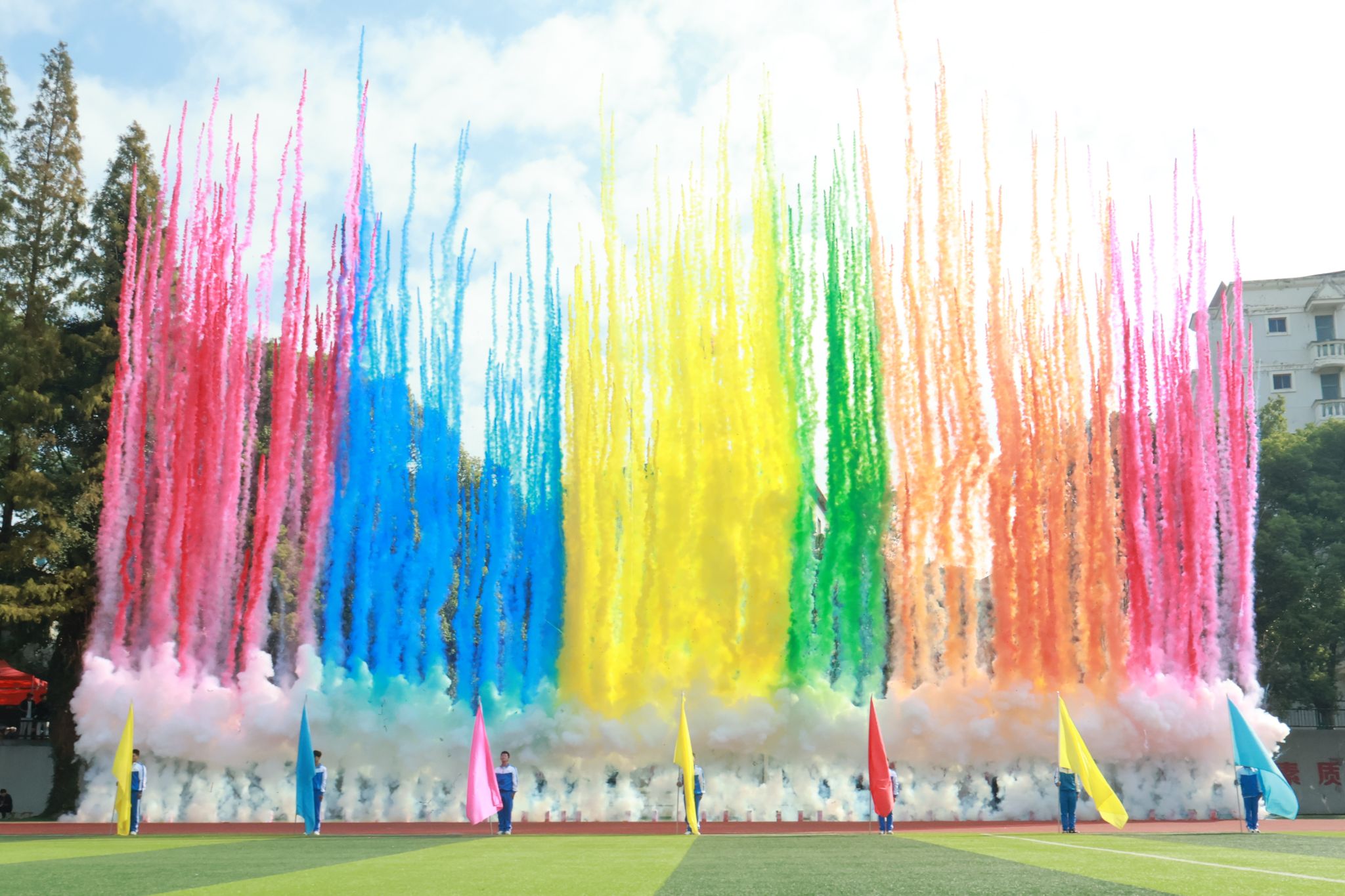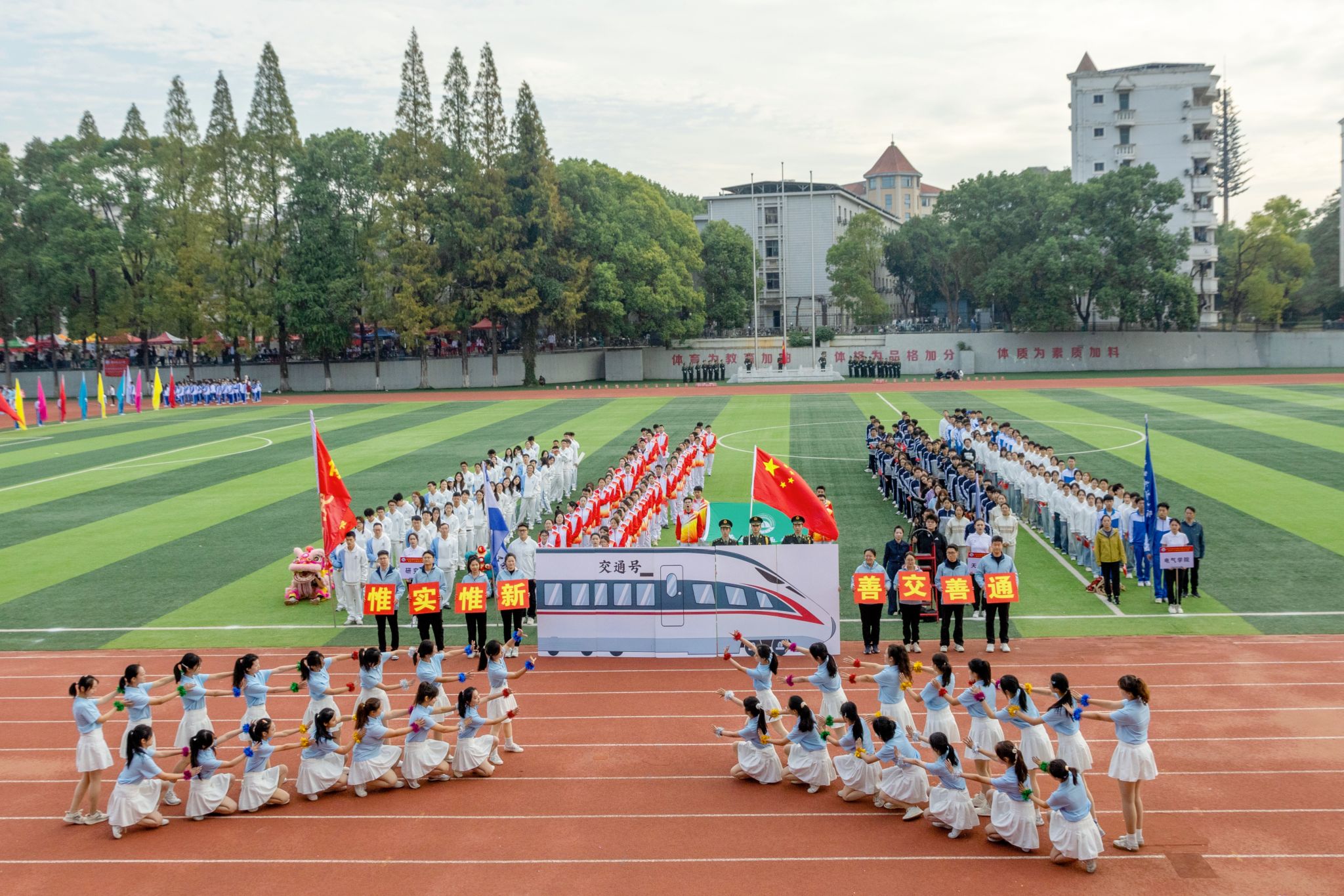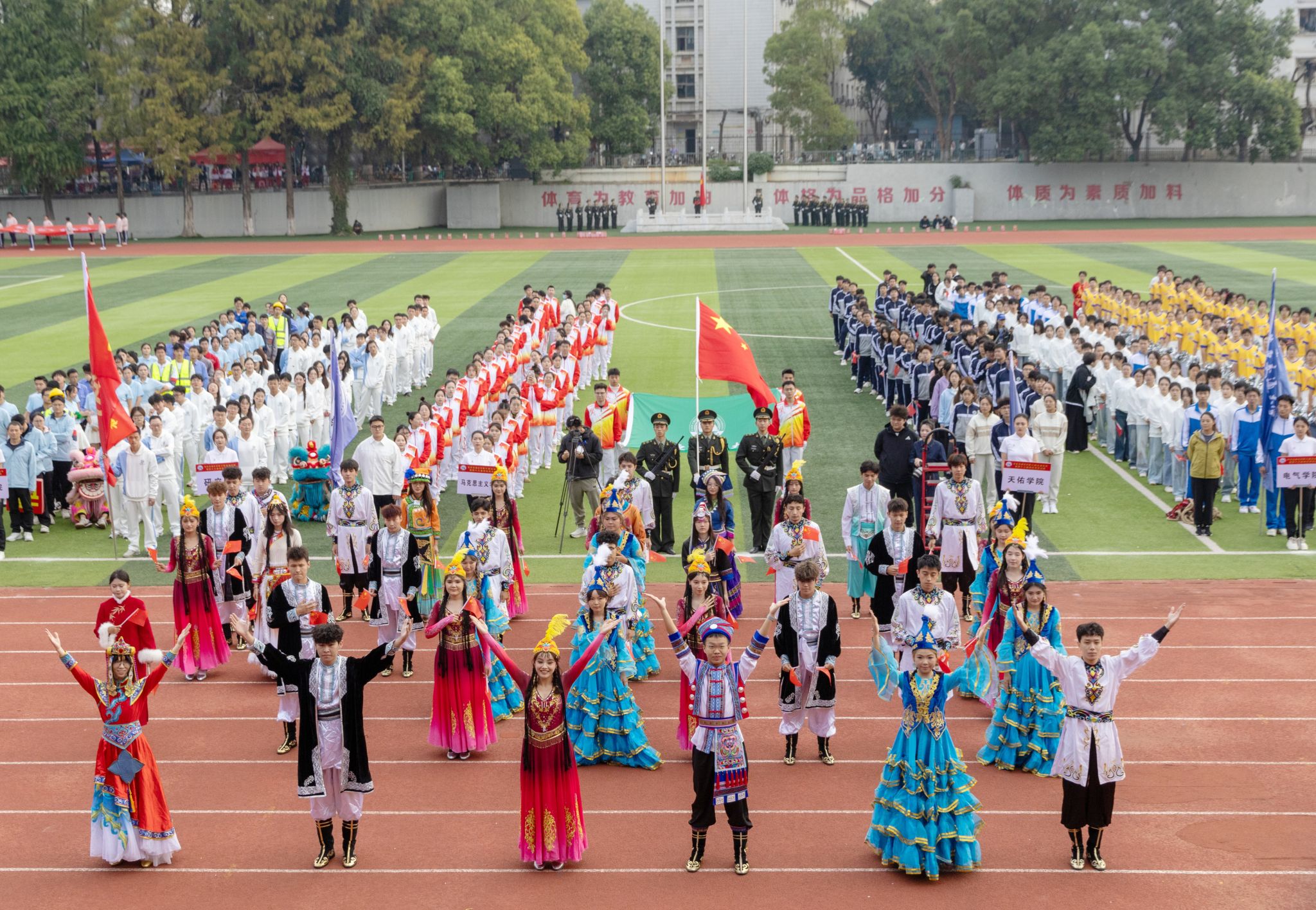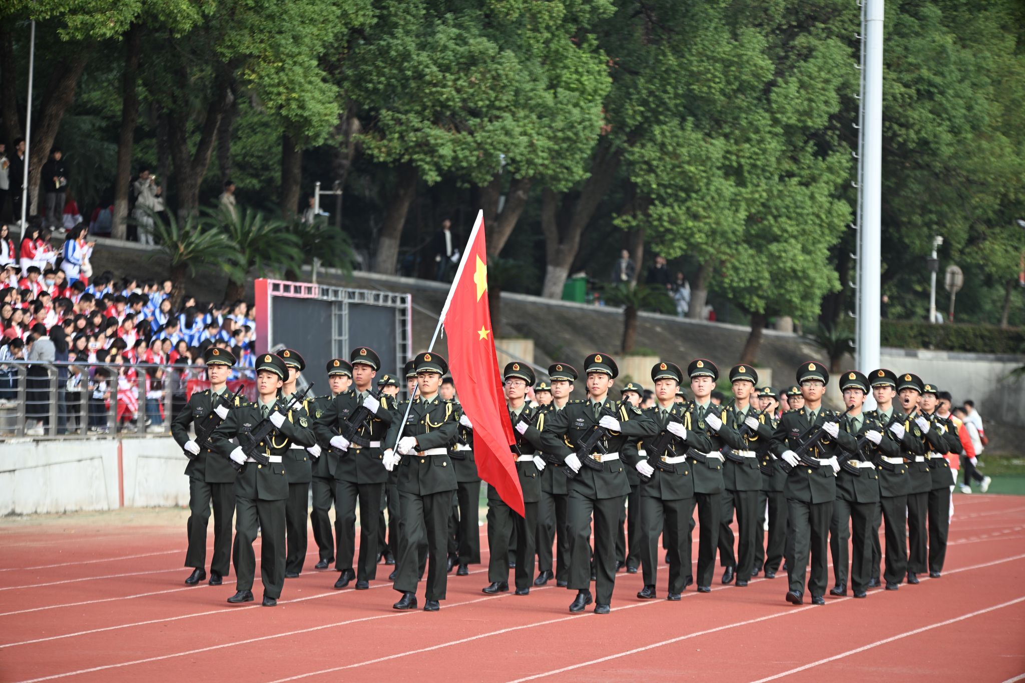 伴着激昂的《运动员进行曲》,国旗队、校旗队、彩旗队依次引领入场,紧随其后的是19个师生方阵队。他们精神抖擞、步伐铿锵,高喊着口号,坚定地走向主席台,尽显青春朝气与昂扬风貌。