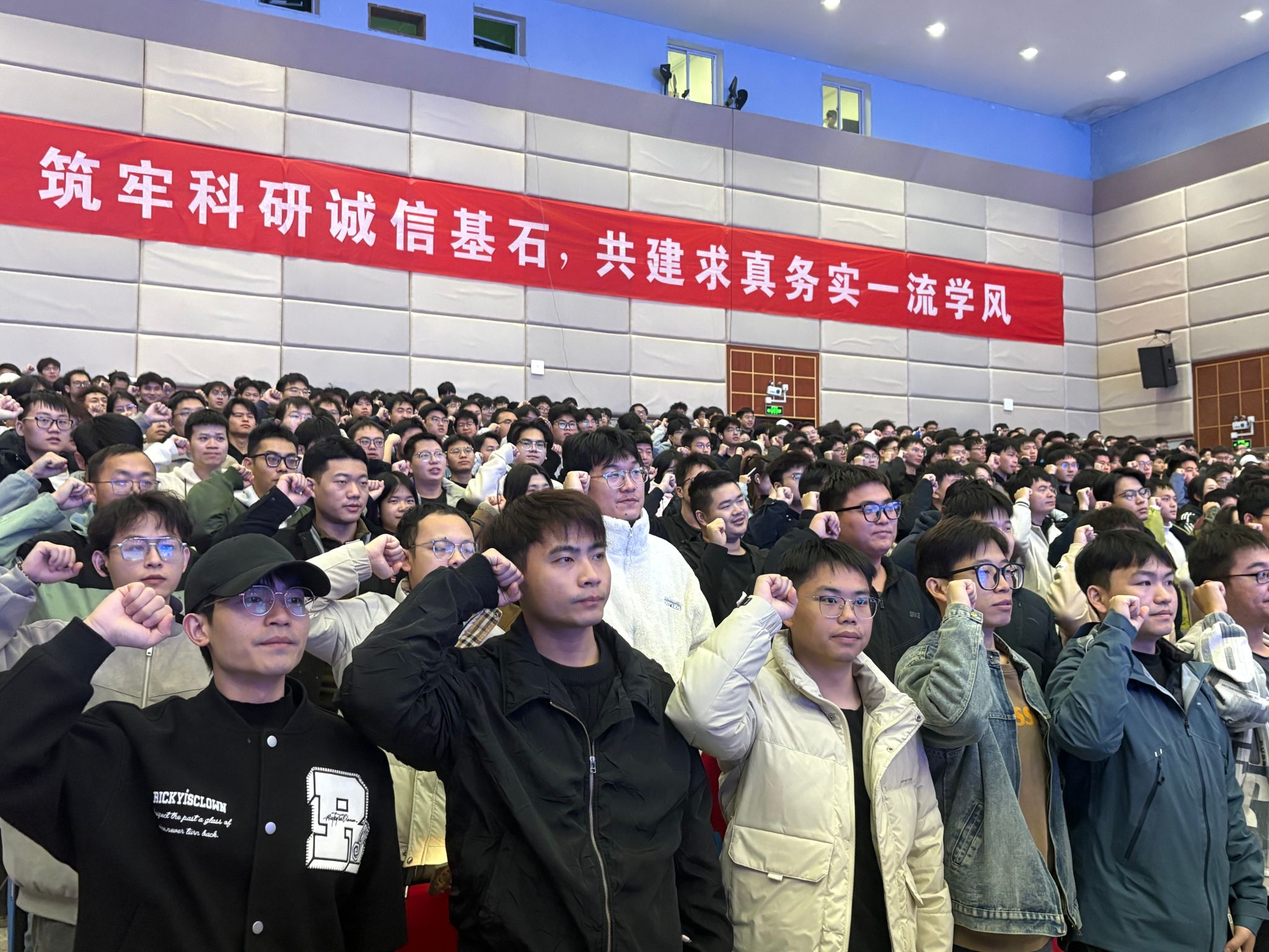在研究生代表倡议环节,我校研究生姚潘朕代表全省研究生发言,倡议全体同学学榜样、传精神,守底线、讲诚信,钻学问、练本领,强氛围、共进步,系好学术生涯“第一粒扣子”。随后,全场研究生起立宣誓,承诺恪守学术规范、捍卫科研真理、弘扬科学家精神,为建设科技强国贡献青春力量。