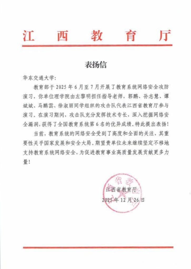近日,江西省教育厅向我校发来表扬信,对我校理学院师生在2025年全国教育系统网络安全攻防演习中取得的优异成绩予以通报表扬。