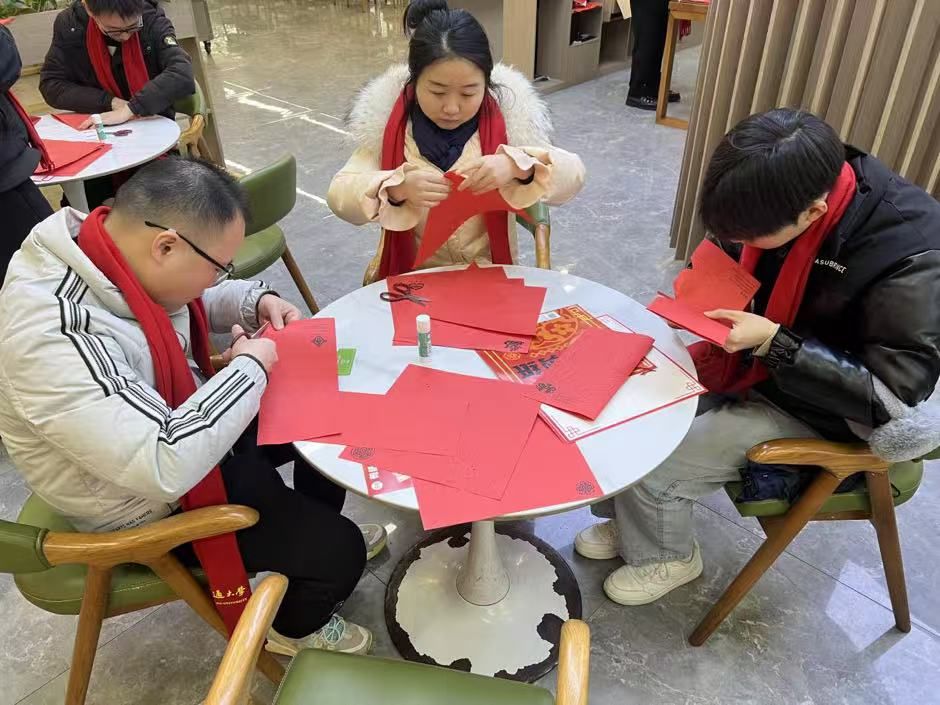 在师生剪窗花互动环节,大家以红纸为材,巧手折剪,创作出福字、生肖纹样等寓意吉祥的作品,在传承传统民俗的过程中拉近了师生距离,营造出浓厚的节日氛围。
