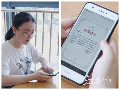 6月12日,华东交通大学2020届毕业生钟柠锘通过该校图书馆的微信公众号,参与了“我和‘阅读’领个证”活动,领取了自己的电子版“阅读证书”。