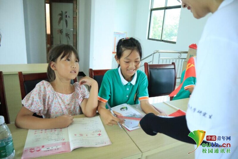 图为服务队成员为李俊杰小朋友分发精心准备的文具礼包。