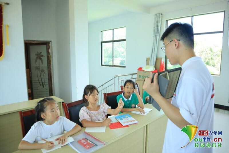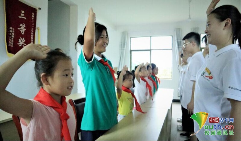 图为服务队成员和小朋友们在课堂上进行激烈的讨论。