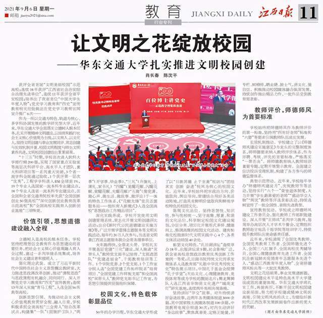 文明之花结硕果,事业发展谱新篇。文明校园建设水平是特色高水平大学建设成效的重要体现。华东交通大学将扎实工作,再接再厉,不断开创文明校园建设新局面,努力把学校建成精神文明的高地、引领文明风尚的沃土,为描绘好新时代江西改革发展新画卷作出新的更大的贡献。(肖长春、陈沈平)