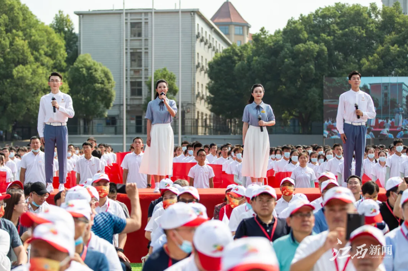 金秋校园里处处洋溢着青春、喜庆和欢乐。崭新的南区田径场,流光溢彩,旌旗飘扬。大会开始前,4000名2021级大一新生组成4个巨型方阵,共同唱响昂扬奋进的青春旋律。巨型方阵变换成中国共产党成立100周年庆祝活动标识、中国地图、中国铁路路徽等图案或字样,彰显了全体华交人铁心跟党走、铁肩担使命的赤诚与担当。