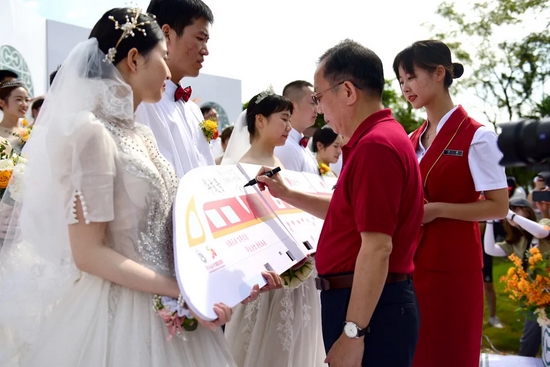 “感谢相遇,牵起你的手,风雨同舟,祸福同渡……”50对伉俪在母校的见证下宣读爱的誓言,交换校庆定制版对戒并拥吻。在用爱心打造的“华交幸福号”列车上,他们留下爱的手印。在观众的欢呼声中,抛出爱的纸飞机、手捧花,将现场气氛推向高潮。