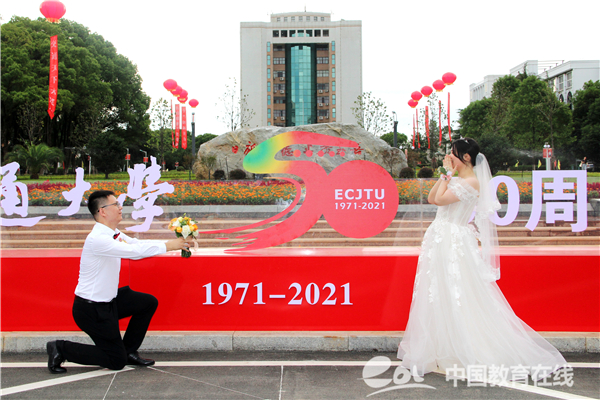 2016级校友王涛与妻子郑丹婷在华交一见倾心、再见定情。“我们的梦想就是回到第一次约会的地方——孔目湖,重温恋爱的时光。”他们含情对视,满眼皆是爱意,“感谢学校提供这次机会,让我们在50周年校庆之际,返校参加这么有纪念意义的婚礼,圆了我们的校园梦!”