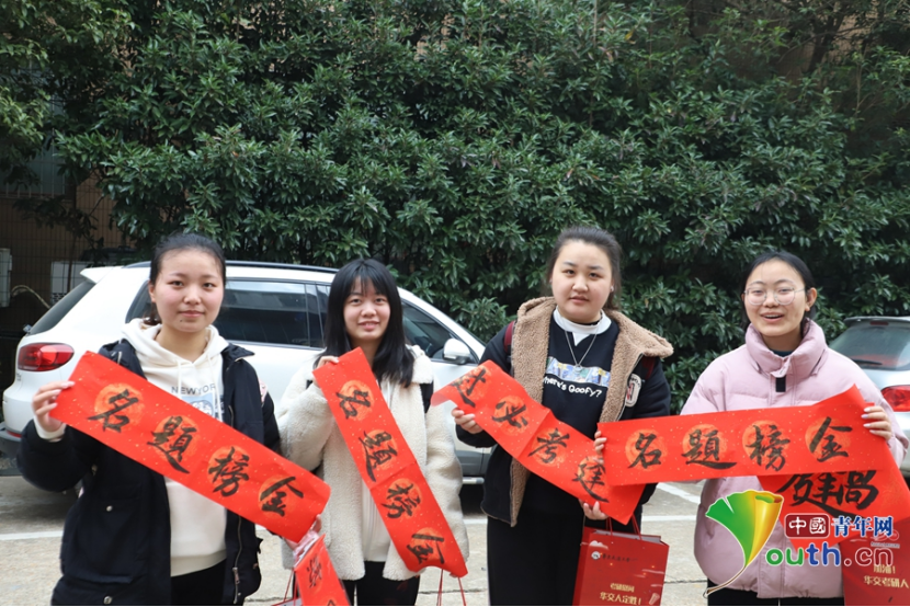 活动现场,该校险峰书画协会还为考研学子送上定制手写祝福对联,为他们加油打气。