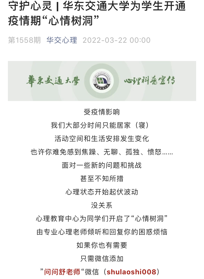 疫情期间,华东交通大学不断丰富心理咨询及预约形式,形成以心理教育中心为主、各学院骨干心理教师为辅的全校咨询服务体系,调动全校专兼职心理教师为学生提供心理辅导。综合使用网络、电话等多种方式积极开展学生心理咨询工作,为学生提供全天候多途径心理健康服务,及时疏导各类心理困扰。