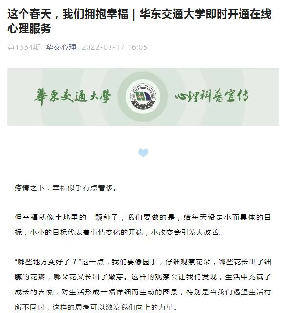 心理健康是一个人生活的原动力,拥有良好心理健康的人,能够从容不迫地应对疫情和未来。华东交通大学发挥自身优势,在这次抗击疫情中,建立了“四全一体”心理健康工作模式,助力建设阳光心态。