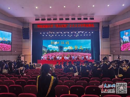 拨穗礼成,全场合唱校歌《奋进,华东交大》,现场领导和老师全体起立,目送2022届毕业生离场,奔赴前程。