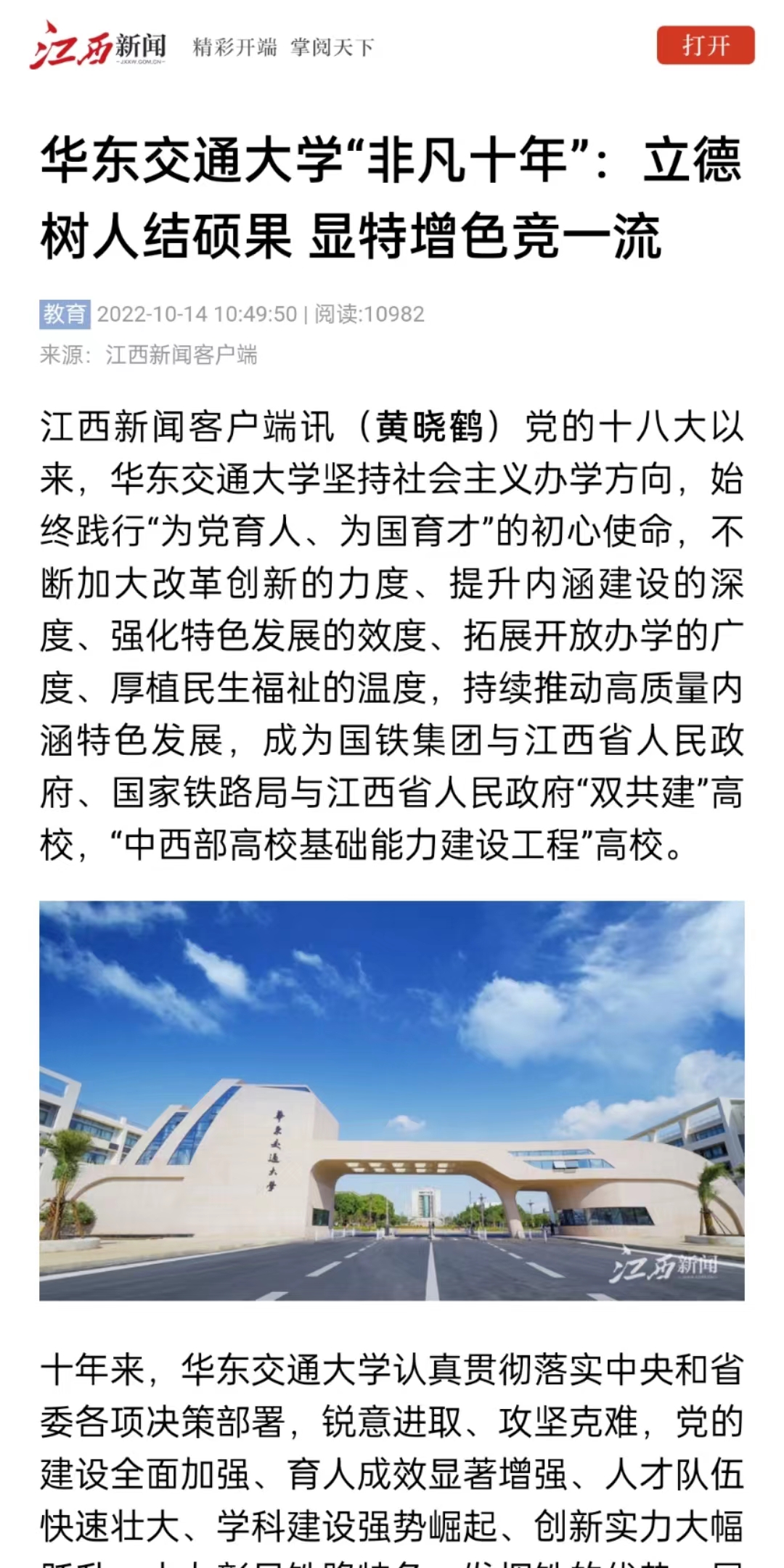 十年来,华东交通大学认真贯彻落实中央和省委各项决策部署,锐意进取、攻坚克难,党的建设全面加强、育人成效显著增强、人才队伍快速壮大、学科建设强势崛起、创新实力大幅跃升,大力彰显铁路特色、发挥铁的优势、展现铁的作为,铁肩对标国家重大战略、铁血攻关行业技术难题、铁心服务江西发展需求,各项事业驶入快车道、跑出加速度、迈上新台阶。