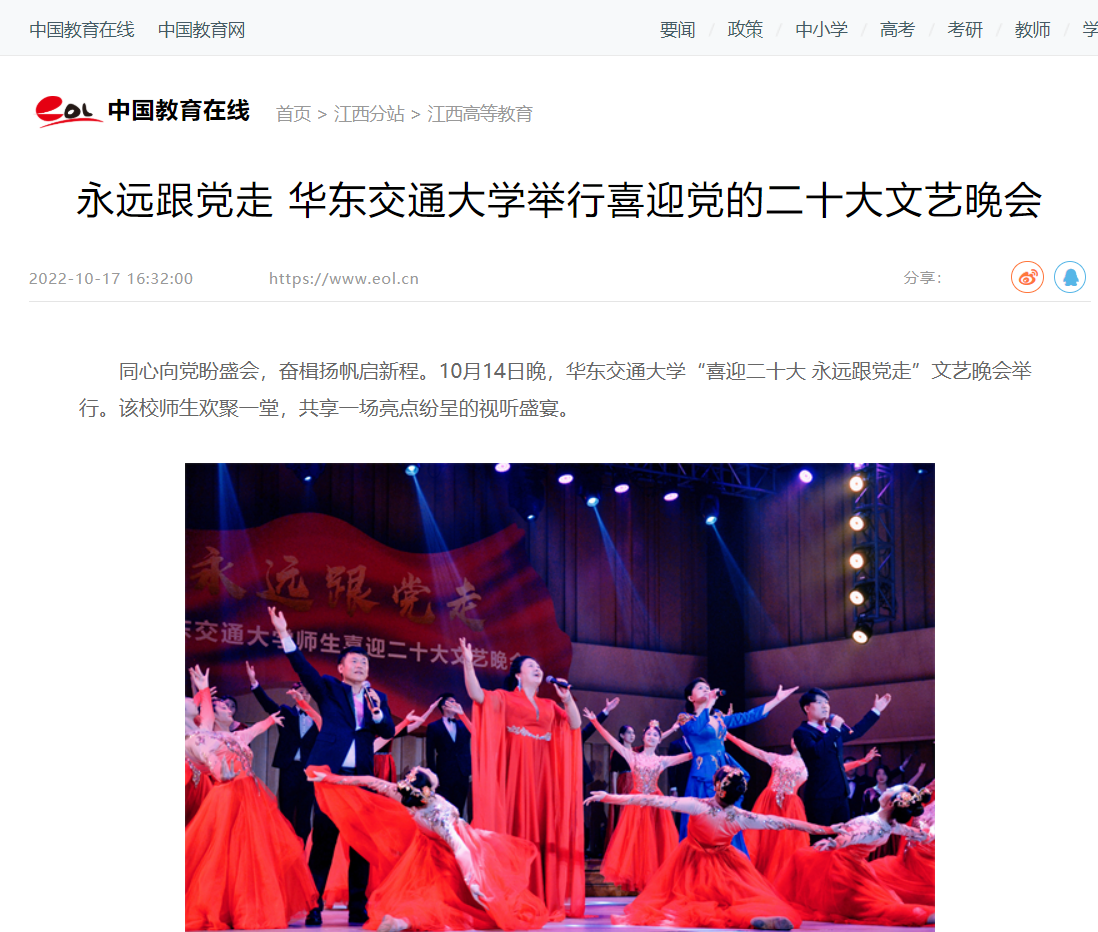 同心向党盼盛会,奋楫扬帆启新程。10月14日晚,华东交通大学“喜迎党的二十大 永远跟党走”文艺晚会举行。该校师生欢聚一堂,共享一场亮点纷呈的视听盛宴。