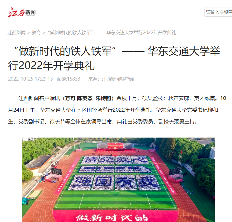 金秋十月,硕果盈枝;秋声寥廓,英才咸集。10月24日上午,华东交通大学在南区田径场举行2022年开学典礼。华东交通大学党委书记柳和生,党委副书记、徐长节等全体在家领导出席,典礼由党委委员、副校长范勇主持。