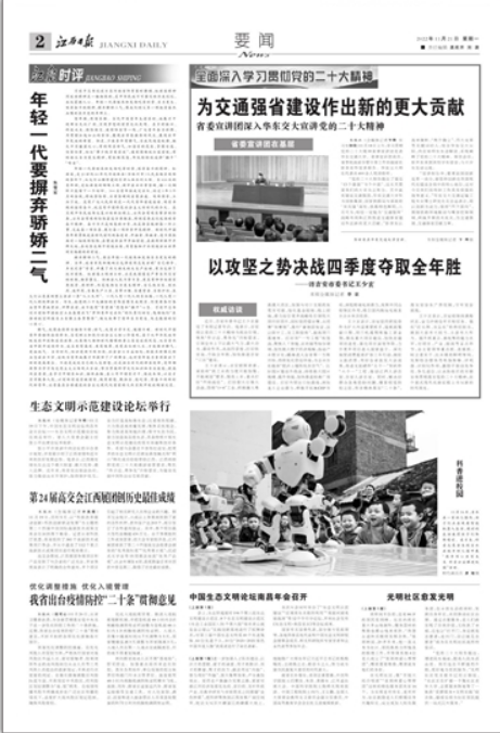 “党的二十大报告提出了建设‘13个强国’‘5个中国’,这尤其需要我们的大学为之努力。其中就有建设交通强国,华东交通大学作为国铁集团、国家铁路局与省政府‘双共建’高校,铁路特色鲜明,大有可为,相信一定能为‘交通强国’战略布局和江西推进交通强省建设作出新的更大贡献。”彭世东以高举旗帜、“两个确立”、伟大变革等关键词切入,结合华东交大实际,向在场师生生动解读、系统阐释了党的二十大精神。报告会后,彭世东来到该校学生宿舍,与大学生互动交流。