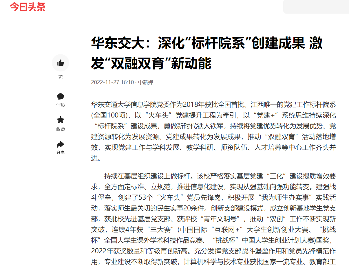 华东交通大学信息学院党委作为2018年获批全国首批、江西唯一的党建工作标杆院系(全国100项),以“火车头”党建提升工程为牵引,以“党建+”系统思维持续深化“标杆院系”建设成果,勇做新时代铁人铁军,持续将党建优势转化为发展优势、党建资源转化为发展资源、党建成果转化为发展成果,推动“双融双育”活动落地增效,实现党建工作与学科发展、教学科研、师资队伍、人才培养等中心工作齐头并进。
