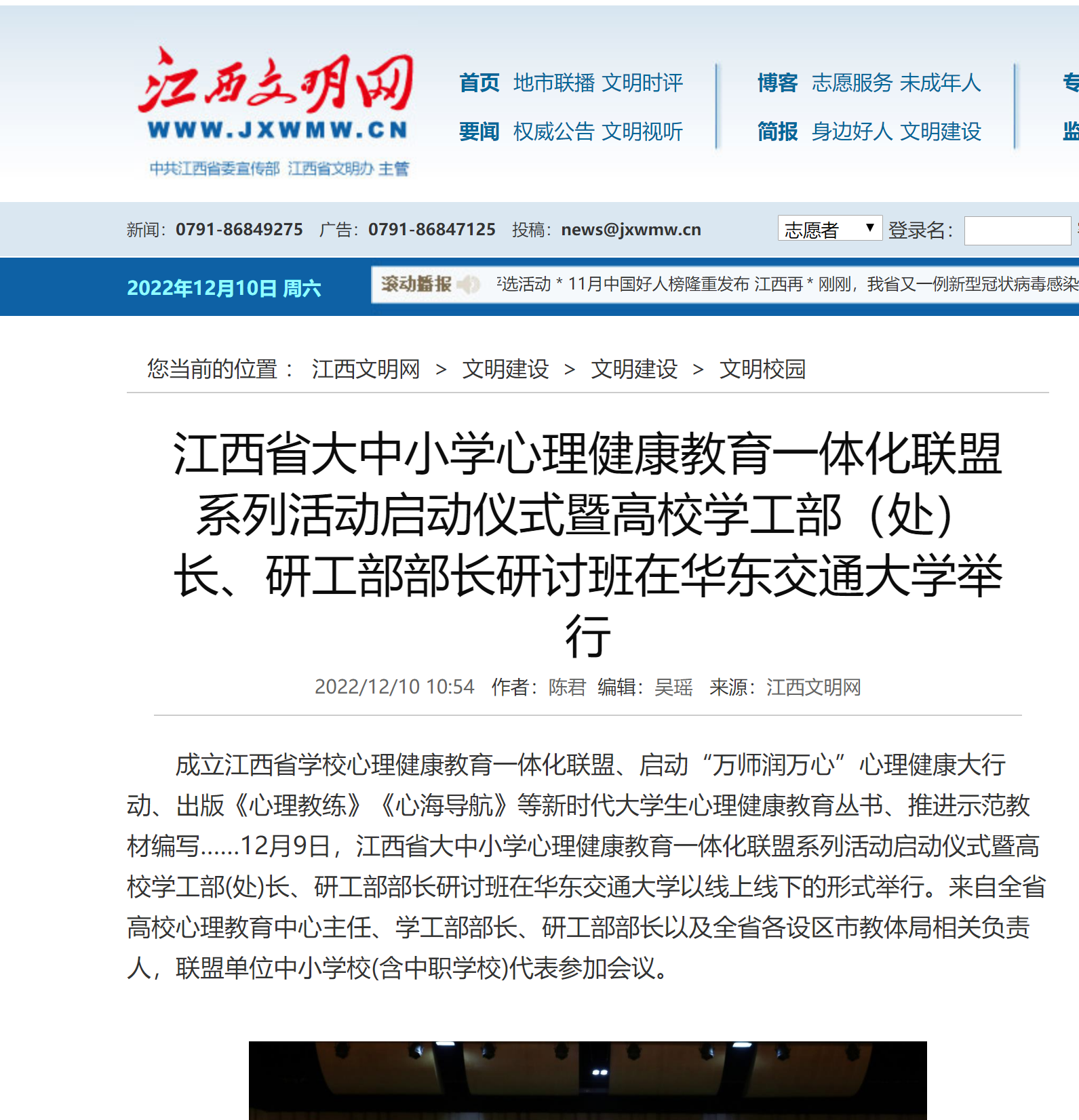成立江西省学校心理健康教育一体化联盟、启动“万师润万心”心理健康大行动、出版《心理教练》《心海导航》等新时代大学生心理健康教育丛书、推进示范教材编写……12月9日,江西省大中小学心理健康教育一体化联盟系列活动启动仪式暨高校学工部(处)长、研工部部长研讨班在华东交通大学以线上线下的形式举行。来自全省高校心理教育中心主任、学工部部长、研工部部长以及全省各设区市教体局相关负责人,联盟单位中小学校(含中职学校)代表参加会议。