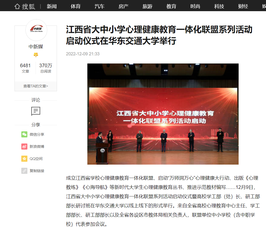 成立江西省学校心理健康教育一体化联盟、启动“万师润万心”心理健康大行动、出版《心理教练》《心海导航》等新时代大学生心理健康教育丛书、推进示范教材编写……12月9日,江西省大中小学心理健康教育一体化联盟系列活动启动仪式暨高校学工部(处)长、研工部部长研讨班在华东交通大学以线上线下的形式举行。来自全省高校心理教育中心主任、学工部部长、研工部部长以及全省各设区市教体局相关负责人,联盟单位中小学校(含中职学校)代表参加会议。