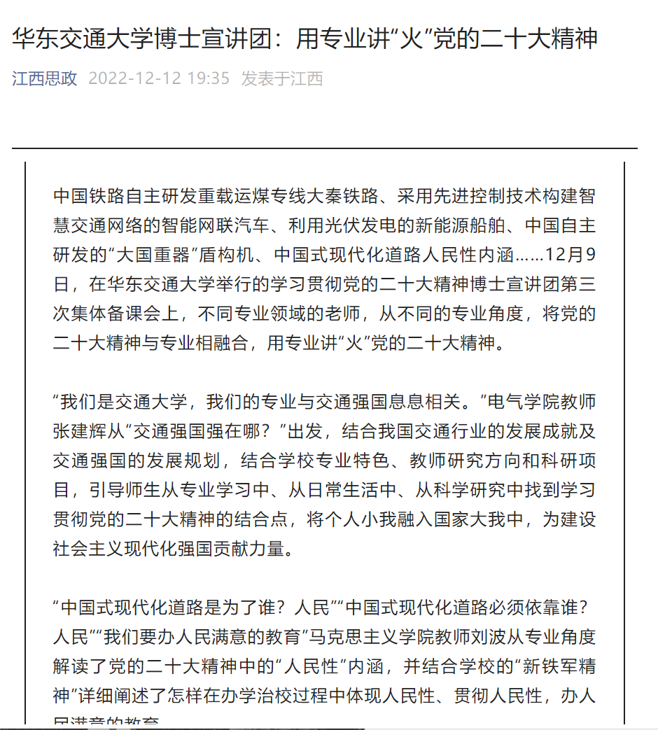 “教育工作者首先是政治工作者,每一位教职员工的政治素质、政治能力都要承担得起为党育人、为国育才的使命。”华东交通大学党委书记柳和生表示,博士宣讲党的二十大精神,带动了博士主动介入思想政治工作,把每门课都变成了传授知识的载体、思想政治教育的载体。