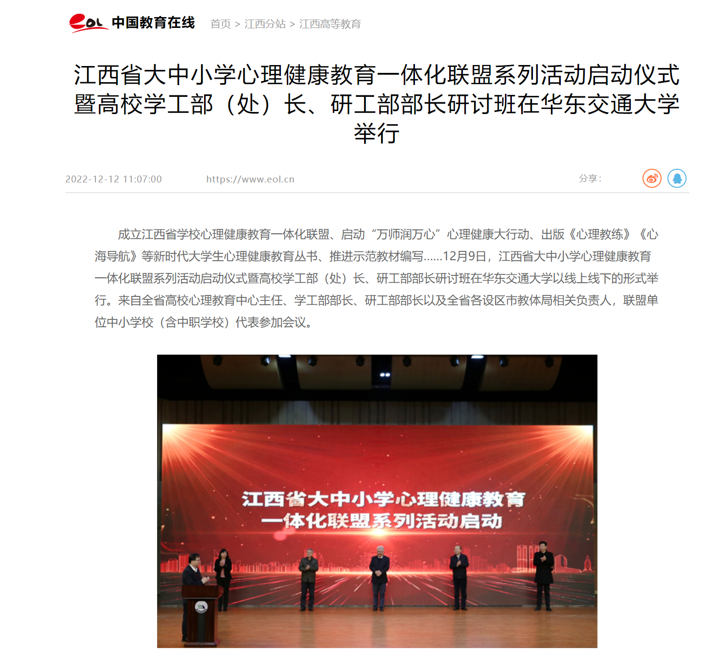 成立江西省学校心理健康教育一体化联盟、启动“万师润万心”心理健康大行动、出版《心理教练》《心海导航》等新时代大学生心理健康教育丛书、推进示范教材编写……12月9日,江西省大中小学心理健康教育一体化联盟系列活动启动仪式暨高校学工部(处)长、研工部部长研讨班在华东交通大学以线上线下的形式举行。来自全省高校心理教育中心主任、学工部部长、研工部部长以及全省各设区市教体局相关负责人,联盟单位中小学校(含中职学校)代表参加会议。