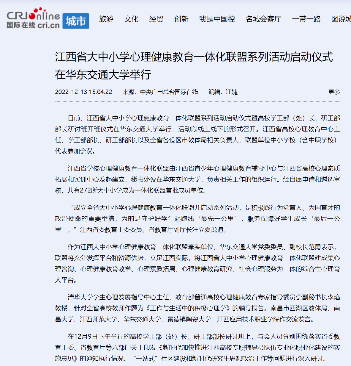 【央广国际在线】江西省大中小学心理健康教育一体化联盟系列活动启动仪式在华东交通大学举行