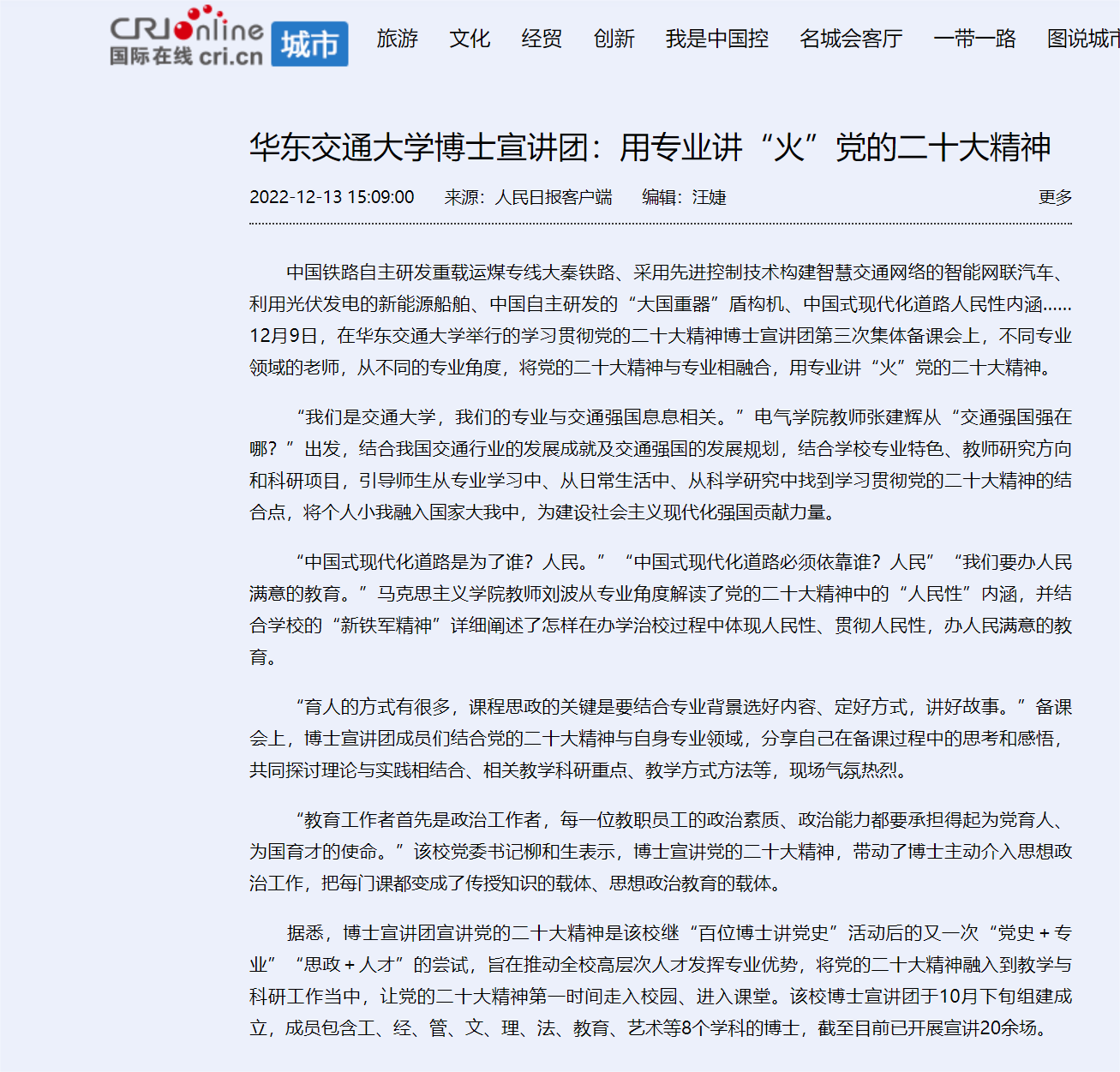 中国铁路自主研发重载运煤专线大秦铁路、采用先进控制技术构建智慧交通网络的智能网联汽车、利用光伏发电的新能源船舶、中国自主研发的“大国重器”盾构机、中国式现代化道路人民性内涵……12月9日,在华东交通大学举行的学习贯彻党的二十大精神博士宣讲团第三次集体备课会上,不同专业领域的老师,从不同的专业角度,将党的二十大精神与专业相融合,用专业讲“火”党的二十大精神。