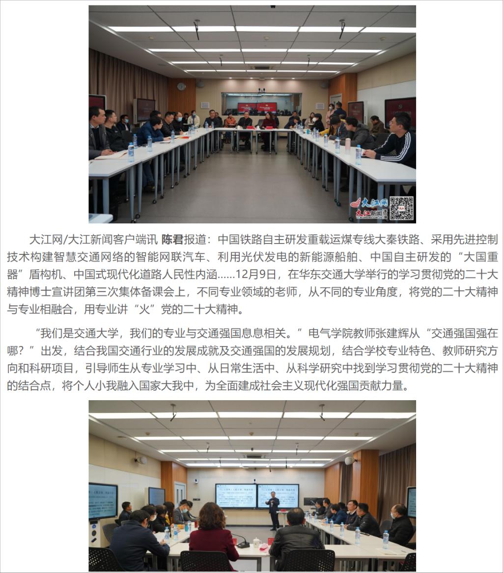 中国铁路自主研发重载运煤专线大秦铁路、采用先进控制技术构建智慧交通网络的智能网联汽车、利用光伏发电的新能源船舶、中国自主研发的“大国重器”盾构机、中国式现代化道路人民性内涵……12月9日,在华东交通大学举行的学习贯彻党的二十大精神博士宣讲团第三次集体备课会上,不同专业领域的老师,从不同的专业角度,将党的二十大精神与专业相融合,用专业讲“火”党的二十大精神。