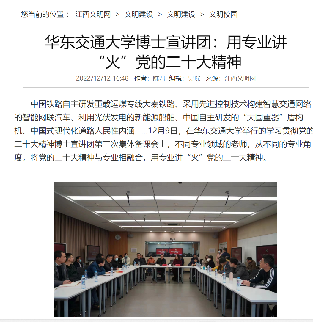 中国铁路自主研发重载运煤专线大秦铁路、采用先进控制技术构建智慧交通网络的智能网联汽车、利用光伏发电的新能源船舶、中国自主研发的“大国重器”盾构机、中国式现代化道路人民性内涵……12月9日,在华东交通大学举行的学习贯彻党的二十大精神博士宣讲团第三次集体备课会上,不同专业领域的老师,从不同的专业角度,将党的二十大精神与专业相融合,用专业讲“火”党的二十大精神。