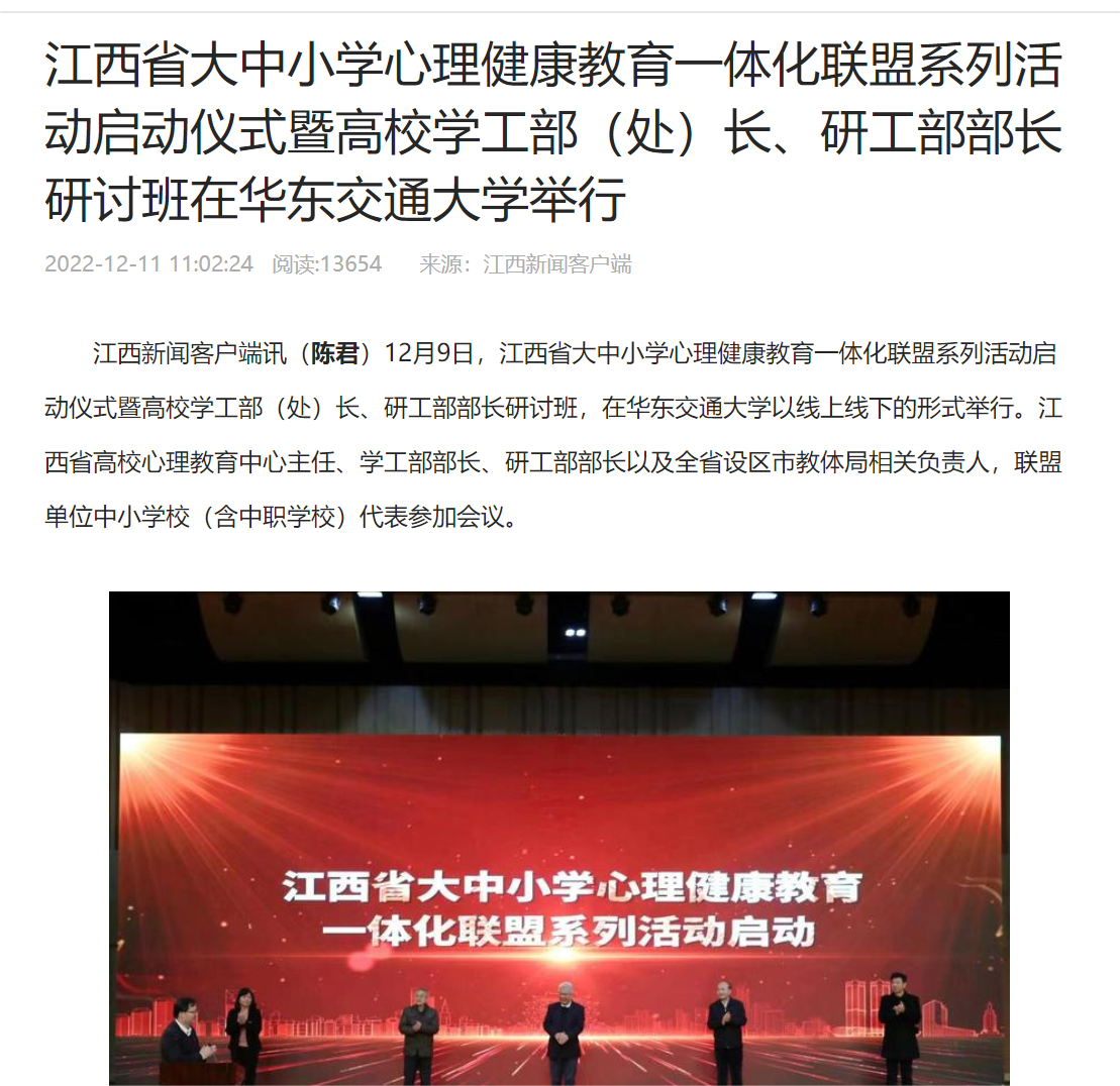 12月9日,江西省大中小学心理健康教育一体化联盟系列活动启动仪式暨高校学工部(处)长、研工部部长研讨班,在华东交通大学以线上线下的形式举行。江西省高校心理教育中心主任、学工部部长、研工部部长以及全省设区市教体局相关负责人,联盟单位中小学校(含中职学校)代表参加会议。