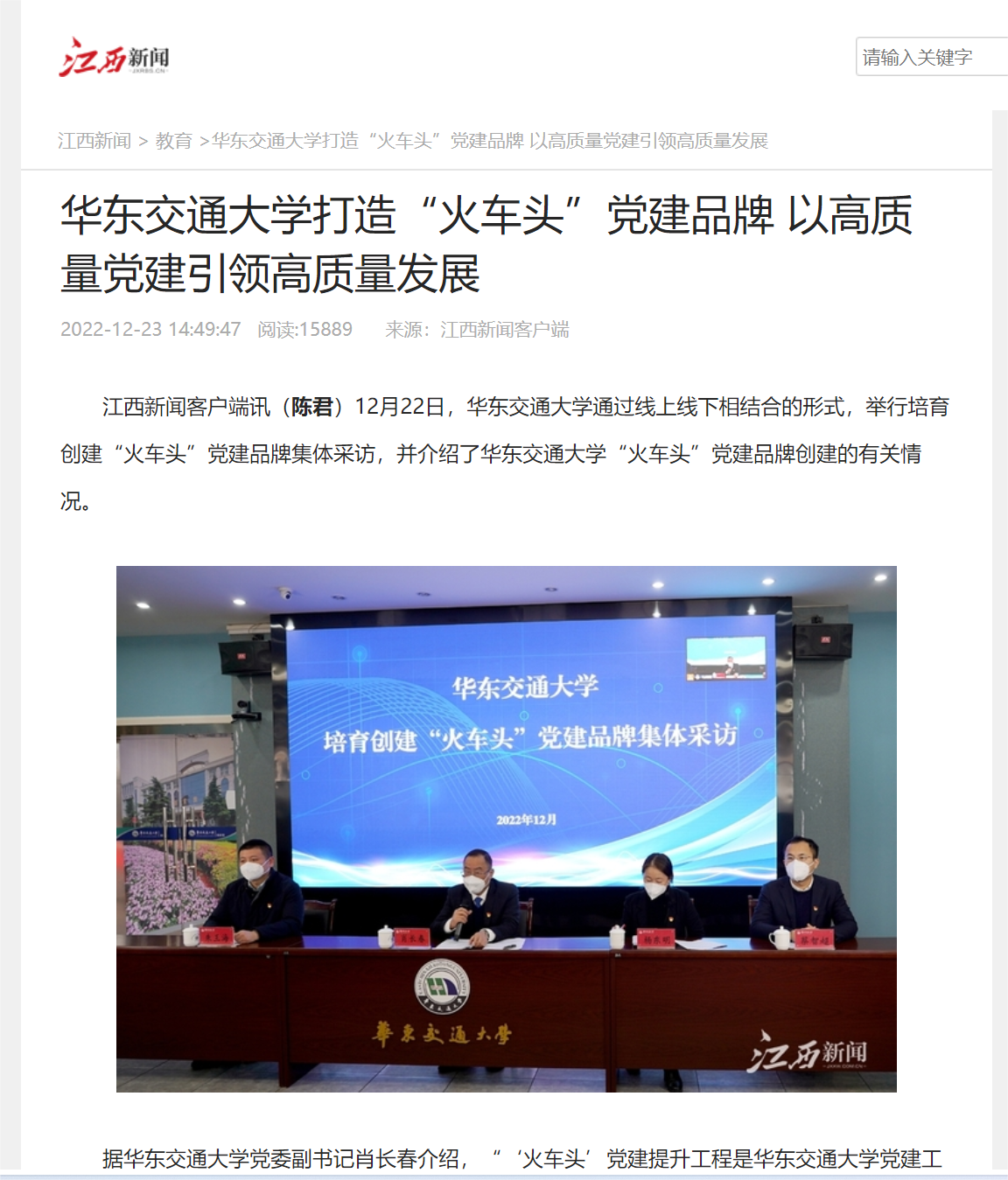 12月22日,华东交通大学通过线上线下相结合的形式,举行培育创建“火车头”党建品牌集体采访,并介绍了华东交通大学“火车头”党建品牌创建的有关情况。