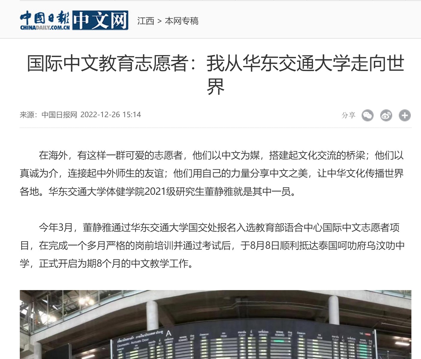 在海外,有这样一群可爱的志愿者,他们以中文为媒,搭建起文化交流的桥梁;他们以真诚为介,连接起中外师生的友谊;他们用自己的力量分享中文之美,让中华文化传播世界各地。华东交通大学体健学院2021级研究生董静雅就是其中一员。