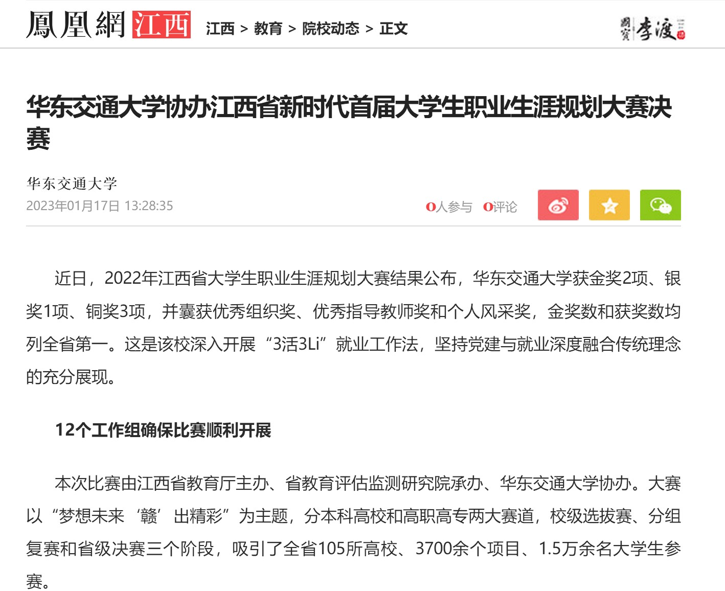 近日,2022年江西省大学生职业生涯规划大赛结果公布,华东交通大学获金奖2项、银奖1项、铜奖3项,并囊获优秀组织奖、优秀指导教师奖和个人风采奖,金奖数和获奖数均列全省第一。这是该校深入开展“3活3Li”就业工作法,坚持党建与就业深度融合传统理念的充分展现。