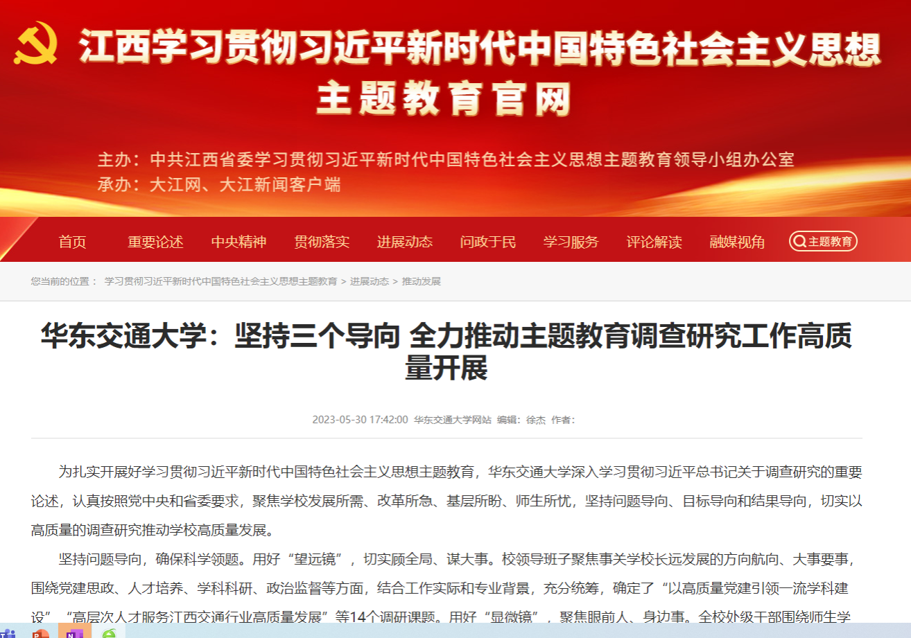 为扎实开展好学习贯彻习近平新时代中国特色社会主义思想主题教育,华东交通大学深入学习贯彻习近平总书记关于调查研究的重要论述,认真按照党中央和省委要求,聚焦学校发展所需、改革所急、基层所盼、师生所忧,坚持问题导向、目标导向和结果导向,切实以高质量的调查研究推动学校高质量发展。