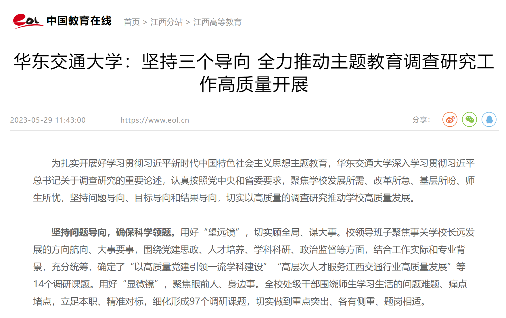 为扎实开展好学习贯彻习近平新时代中国特色社会主义思想主题教育,华东交通大学深入学习贯彻习近平总书记关于调查研究的重要论述,认真按照党中央和省委要求,聚焦学校发展所需、改革所急、基层所盼、师生所忧,坚持问题导向、目标导向和结果导向,切实以高质量的调查研究推动学校高质量发展。