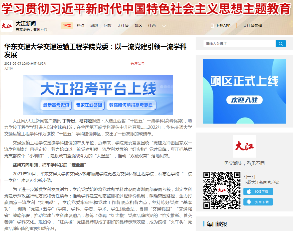 大江网/大江新闻客户端讯丁锋贵、马莉娅报道:入选江西省“十四五”一流学科(高峰优势),助力学校工程学学科进入ESI全球前1%,在全国第五轮学科评估中升档晋级……2022年,华东交通大学交通运输工程学科作为该校“十四五”学科建设特区,交出了一份亮眼的成绩单。