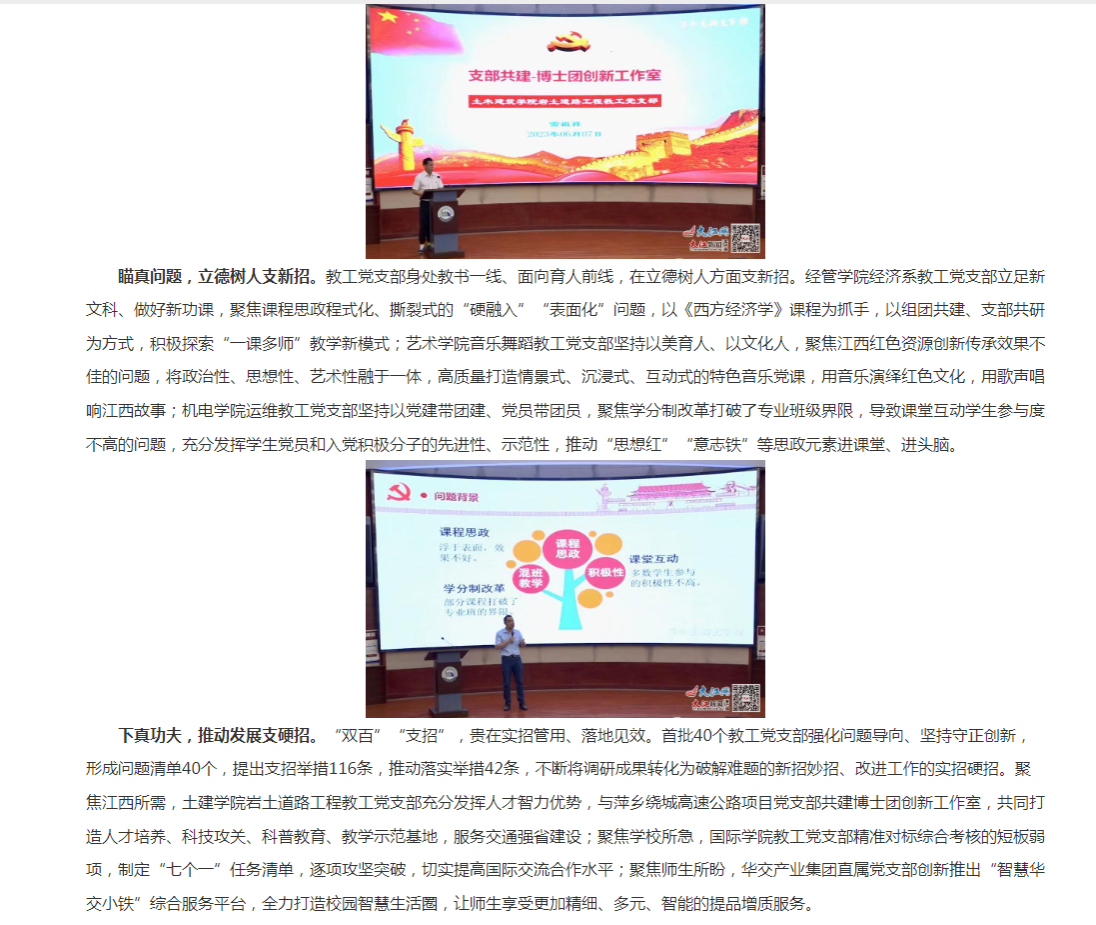 下真功夫,推动发展支硬招。“双百”“支招”,贵在实招管用、落地见效。首批40个教工党支部强化问题导向、坚持守正创新,形成问题清单40个,提出支招举措116条,推动落实举措42条,不断将调研成果转化为破解难题的新招妙招、改进工作的实招硬招。聚焦江西所需,土建学院岩土道路工程教工党支部充分发挥人才智力优势,与萍乡绕城高速公路项目党支部共建博士团创新工作室,共同打造人才培养、科技攻关、科普教育、教学示范基地,服务交通强省建设;聚焦学校所急,国际学院教工党支部精准对标综合考核的短板弱项,制定“七个一”任务清单,逐项攻坚突破,切实提高国际交流合作水平;聚焦师生所盼,华交产业集团直属党支部创新推出“智慧华交小铁”综合服务平台,全力打造校园智慧生活圈,让师生享受更加精细、多元、智能的提品增质服务。