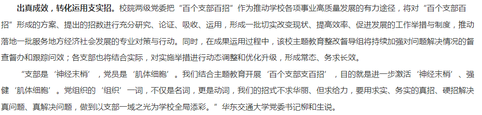 “支部是‘神经末梢’,党员是‘肌体细胞’。我们结合主题教育开展‘百个支部支百招’,目的就是进一步激活‘神经末梢’、强健‘肌体细胞’。党组织的‘组织’一词,不仅是名词,更是动词,我们的招式不求华丽、但求给力,要用求实、务实的真招、硬招解决真问题、真解决问题,做到以支部一域之光为学校全局添彩。”华东交通大学党委书记柳和生说。