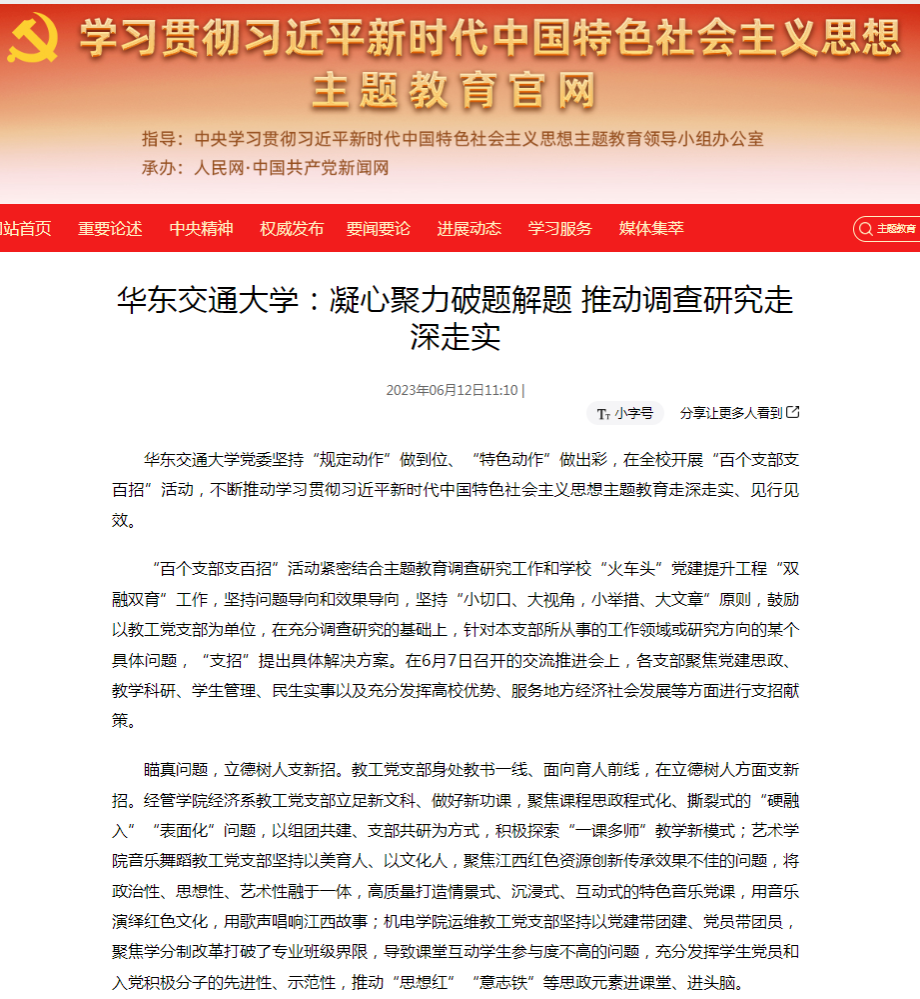 华东交通大学党委坚持“规定动作”做到位、“特色动作”做出彩,在全校开展“百个支部支百招”活动,不断推动学习贯彻习近平新时代中国特色社会主义思想主题教育走深走实、见行见效。