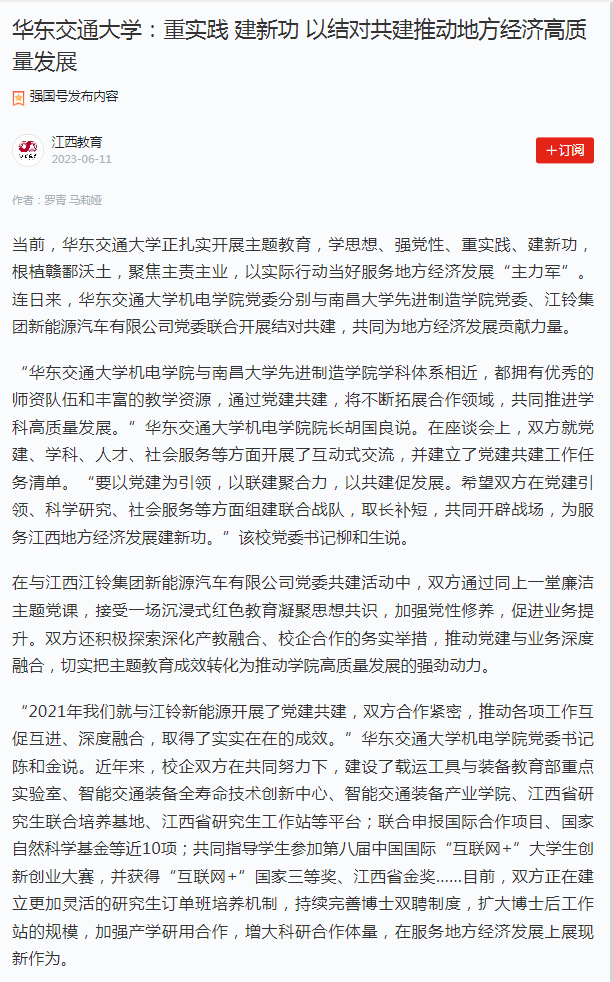 “2021年我们就与江铃新能源开展了党建共建,双方合作紧密,推动各项工作互促互进、深度融合,取得了实实在在的成效。”华东交通大学机电学院党委书记陈和金说。近年来,校企双方在共同努力下,建设了载运工具与装备教育部重点实验室、智能交通装备全寿命技术创新中心、智能交通装备产业学院、江西省研究生联合培养基地、江西省研究生工作站等平台;联合申报国际合作项目、国家自然科学基金等近10项;共同指导学生参加第八届中国国际“互联网+”大学生创新创业大赛,并获得“互联网+”国家三等奖、江西省金奖……目前,双方正在建立更加灵活的研究生订单班培养机制,持续完善博士双聘制度,扩大博士后工作站的规模,加强产学研用合作,增大科研合作体量,在服务地方经济发展上展现新作为。