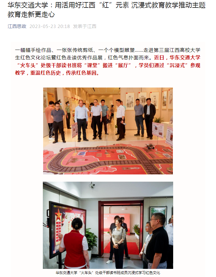 华东交通大学将主题参观江西省红色文化论坛暨红色走读优秀作品展纳入“火车头”处级干部读书班理论学习内容,是提升理论学习质效的一次生动实践,进一步深化了党员干部对习近平总书记视察江西重要讲话精神的领会把握,对中国共产党人精神谱系的认知感悟。“江西拥有丰富的红色资源,通过创新形式、丰富载体,深入挖掘红色文化丰富内涵,生动鲜活讲好红色故事,教育引导广大党员干部深刻感悟初心使命和信仰的力量,扎实推动主题教育理论学习走深走实、落地落细。”华东交通大学宣传部负责人说。