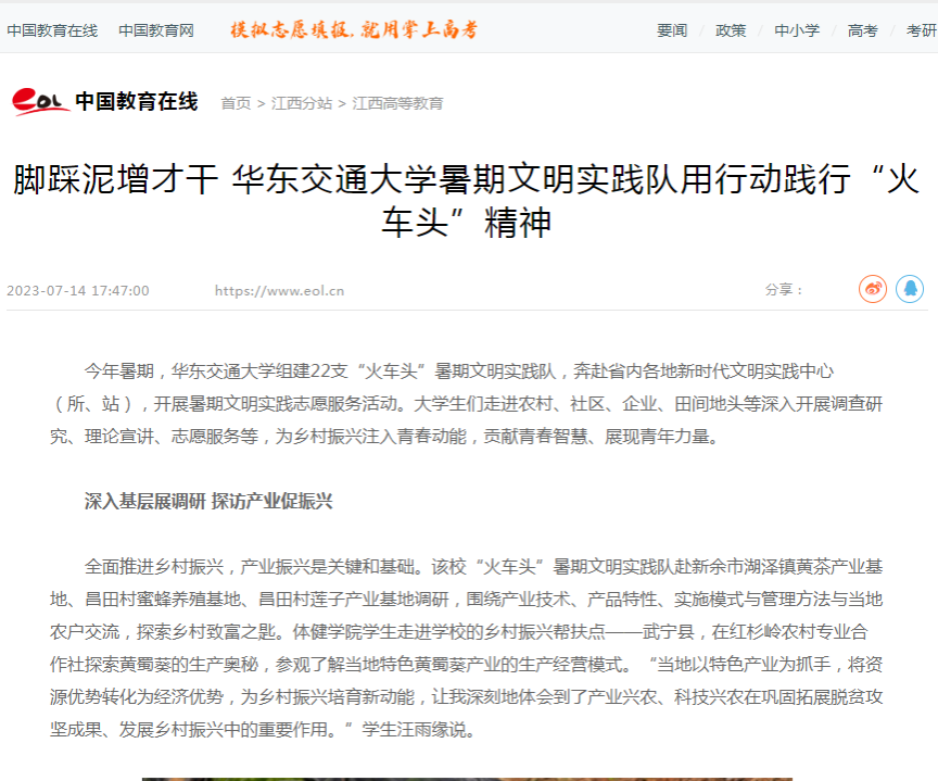 勇当“火车头”,青春建新功。华东交通大学暑期文明实践队以实干书写奋进,以实践淬炼青春,在广袤的田间地头上好与现实相结合的“大思政课”,用双肩担当“铁”的使命,用行动诠释“铁”的精神,用汗水浇灌良田,将专业所长用于振兴乡村经济和产业发展,争做有理想、敢担当、能吃苦、肯奋斗的新时代青年。