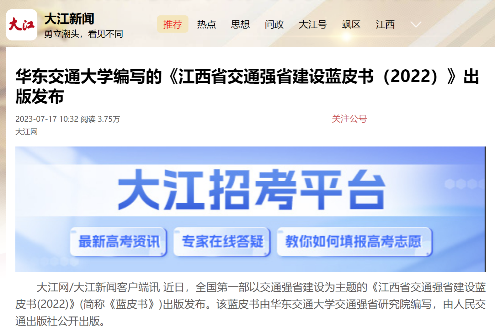 近日,全国第一部以交通强省建设为主题的《江西省交通强省建设蓝皮书(2022)》(简称《蓝皮书》)出版发布。该蓝皮书由华东交通大学交通强省研究院编写,由人民交通出版社公开出版。