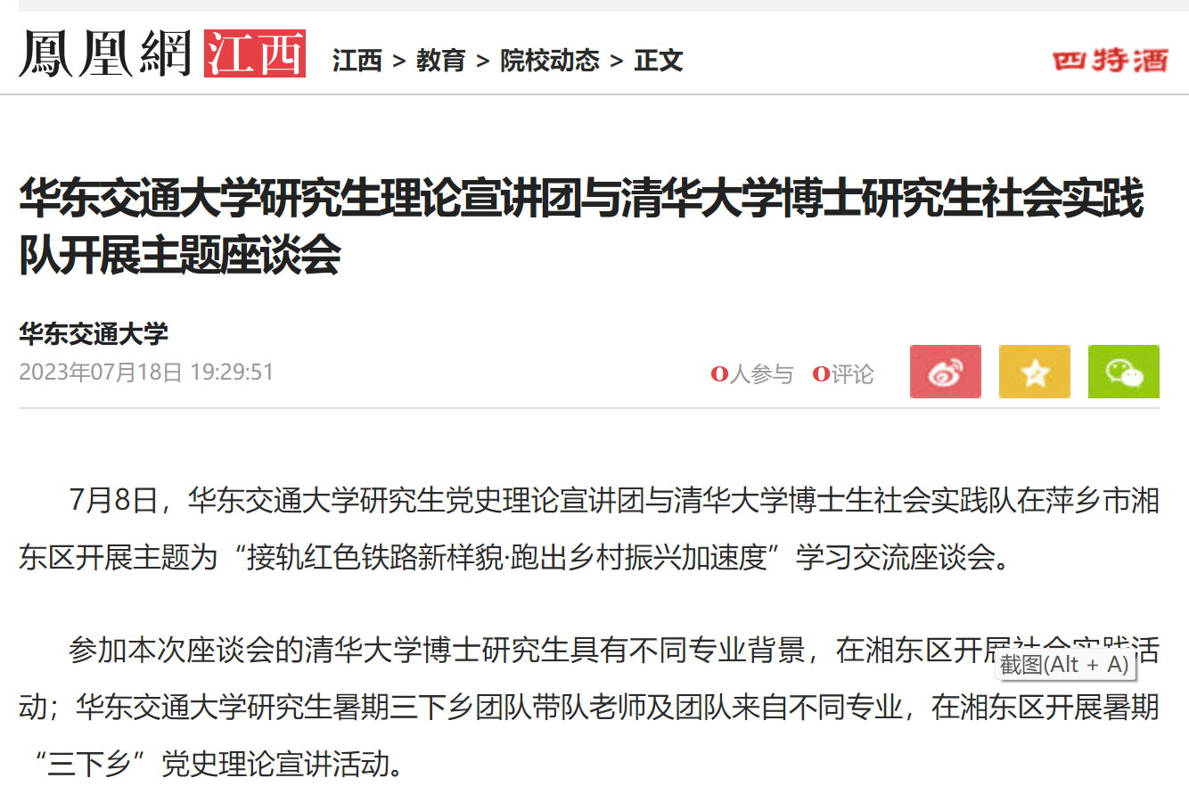 7月8日,华东交通大学研究生党史理论宣讲团与清华大学博士生社会实践队在萍乡市湘东区开展主题为“接轨红色铁路新样貌·跑出乡村振兴加速度”学习交流座谈会。