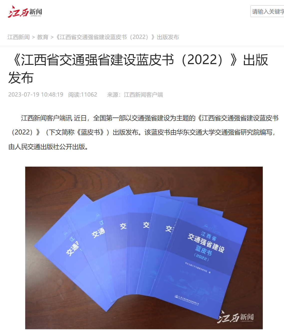 江西新闻客户端讯 近日,全国第一部以交通强省建设为主题的《江西省交通强省建设蓝皮书(2022)》(下文简称《蓝皮书》)出版发布。该蓝皮书由华东交通大学交通强省研究院编写,由人民交通出版社公开出版。