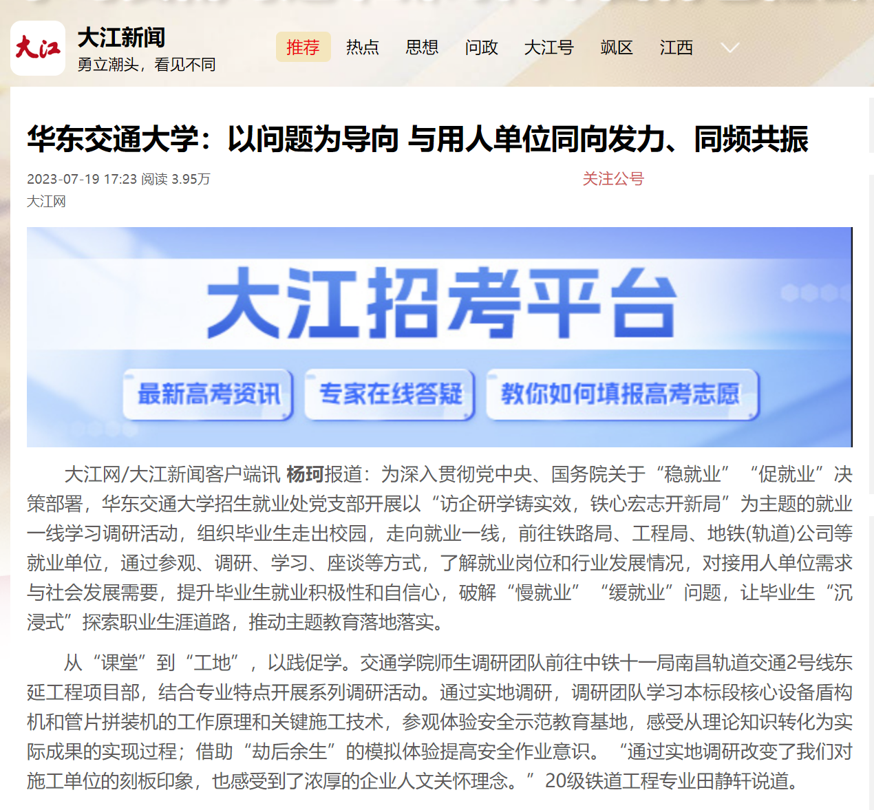 为深入贯彻党中央、国务院关于“稳就业”“促就业”决策部署,华东交通大学招生就业处党支部开展以“访企研学铸实效,铁心宏志开新局”为主题的就业一线学习调研活动,组织毕业生走出校园,走向就业一线,前往铁路局、工程局、地铁(轨道)公司等就业单位,通过参观、调研、学习、座谈等方式,了解就业岗位和行业发展情况,对接用人单位需求与社会发展需要,提升毕业生就业积极性和自信心,破解“慢就业”“缓就业”问题,让毕业生“沉浸式”探索职业生涯道路,推动主题教育落地落实。