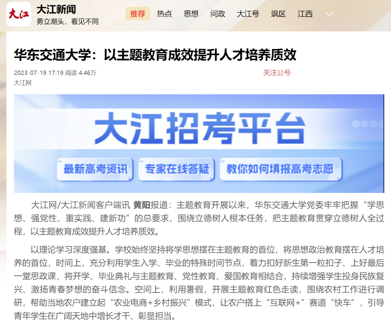 主题教育开展以来,华东交通大学党委牢牢把握“学思想、强党性、重实践、建新功”的总要求,围绕立德树人根本任务,把主题教育贯穿立德树人全过程,以主题教育成效提升人才培养质效。