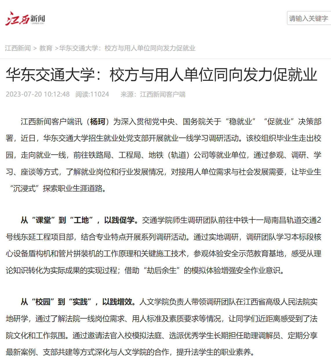 华东交通大学招生就业处党支部为毕业生的职业发展“扑下身”“沉下去”与用人单位同向发力、同频共振,既能够让学生通过自己的视角了解用人单位,同时也加强了学院与企业之间的合作,进一步挖掘岗位资源,为就业工作开展奠定坚实基础,为促进毕业生高质量充分就业拓展新思路。