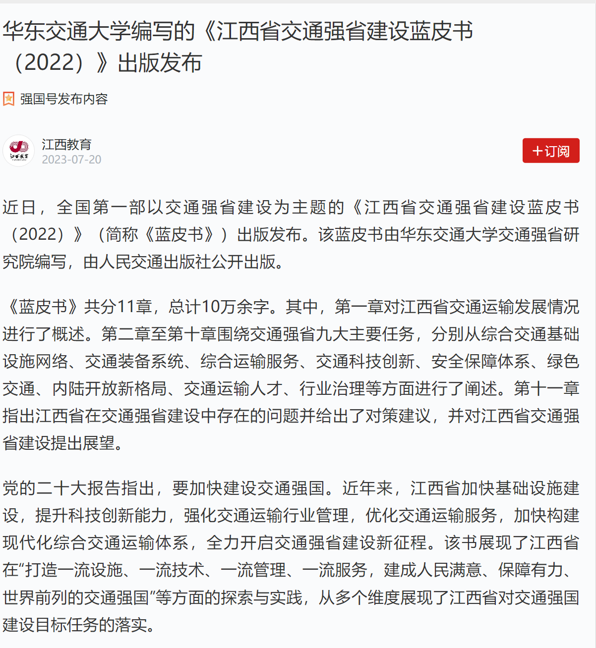近日,全国第一部以交通强省建设为主题的《江西省交通强省建设蓝皮书(2022)》(简称《蓝皮书》)出版发布。该蓝皮书由华东交通大学交通强省研究院编写,由人民交通出版社公开出版。