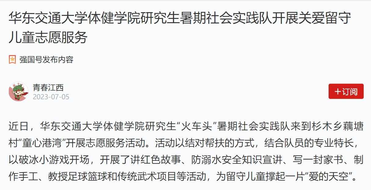近日,华东交通大学体健学院研究生“火车头”暑期社会实践队来到杉木乡藕塘村“童心港湾”开展志愿服务活动。活动以结对帮扶的方式,结合队员的专业特长,以破冰小游戏开场,开展了讲红色故事、防溺水安全知识宣讲、写一封家书、制作手工、教授足球篮球和传统武术项目等活动,为留守儿童撑起一片“爱的天空”。