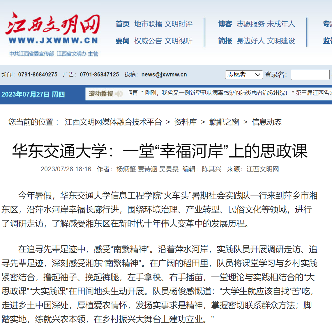 今年暑假,华东交通大学信息工程学院“火车头”暑期社会实践队一行来到萍乡市湘东区,沿萍水河岸幸福长廊行进,围绕环境治理、产业转型、民俗文化等领域,进行了调研走访,了解感受湘东区在新时代十年伟大变革中的发展历程。
